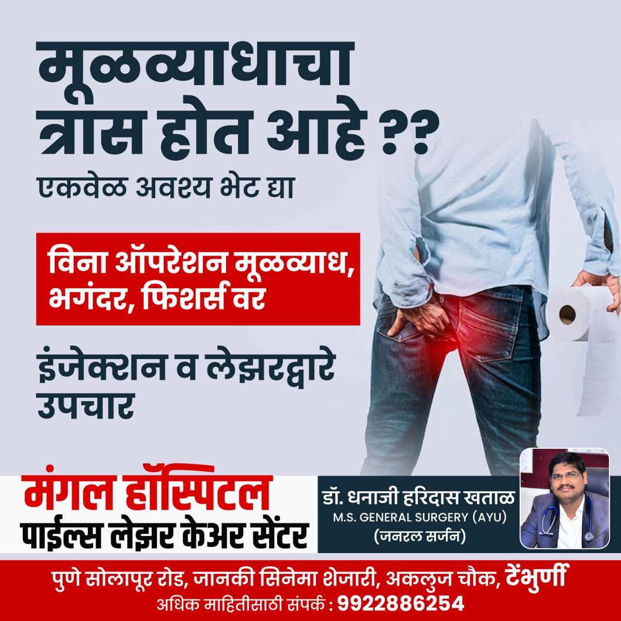 आपल्या टेंभुर्णी सारख्या ग्रामीण एरिया मध्ये मंगल हॉस्पिटल चे माध्यमातून डॉ. धनाजी खताळ सरांनी चांगल्या प्रकारची म्हणजे की पुणे सारख्या शहरी हॉस्पिटल समान सुविधा सुरू केलेली आहे. मीही यांचे दवाखान्यात मूळव्याध आजाराचे लेझर ऑपरेशन केले आहे. साधारण दोन वर्षे होऊन गेली काहीही तक्रार नाही. तसेच आमची मैत्री मंगल हेल्थ क्लब चे माध्यमातून आणखी घट्ट झाली. धन्यवाद डॉक्टर साहेब